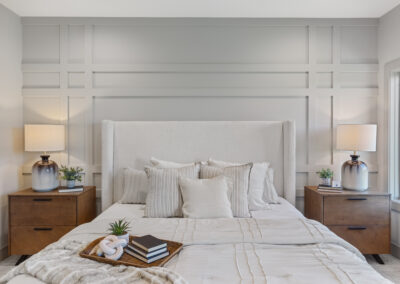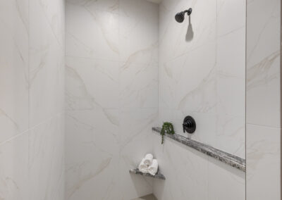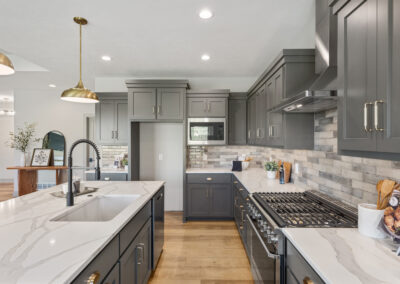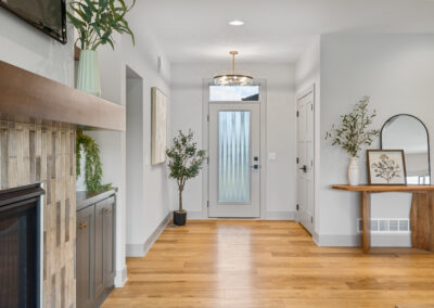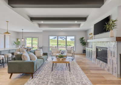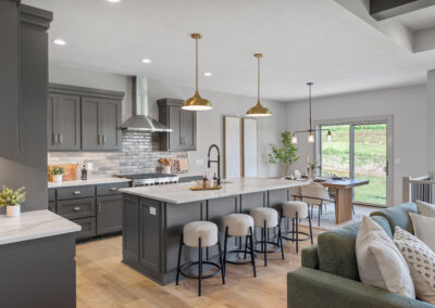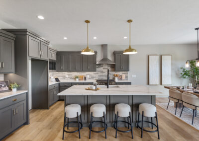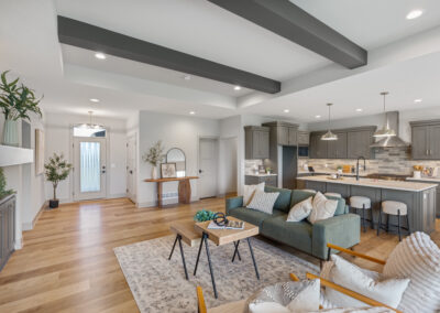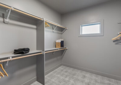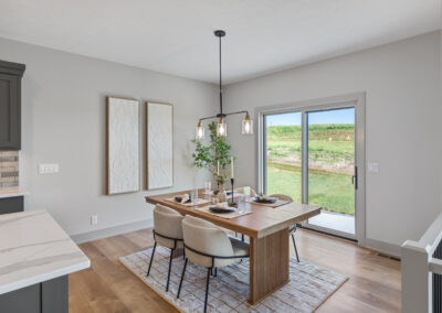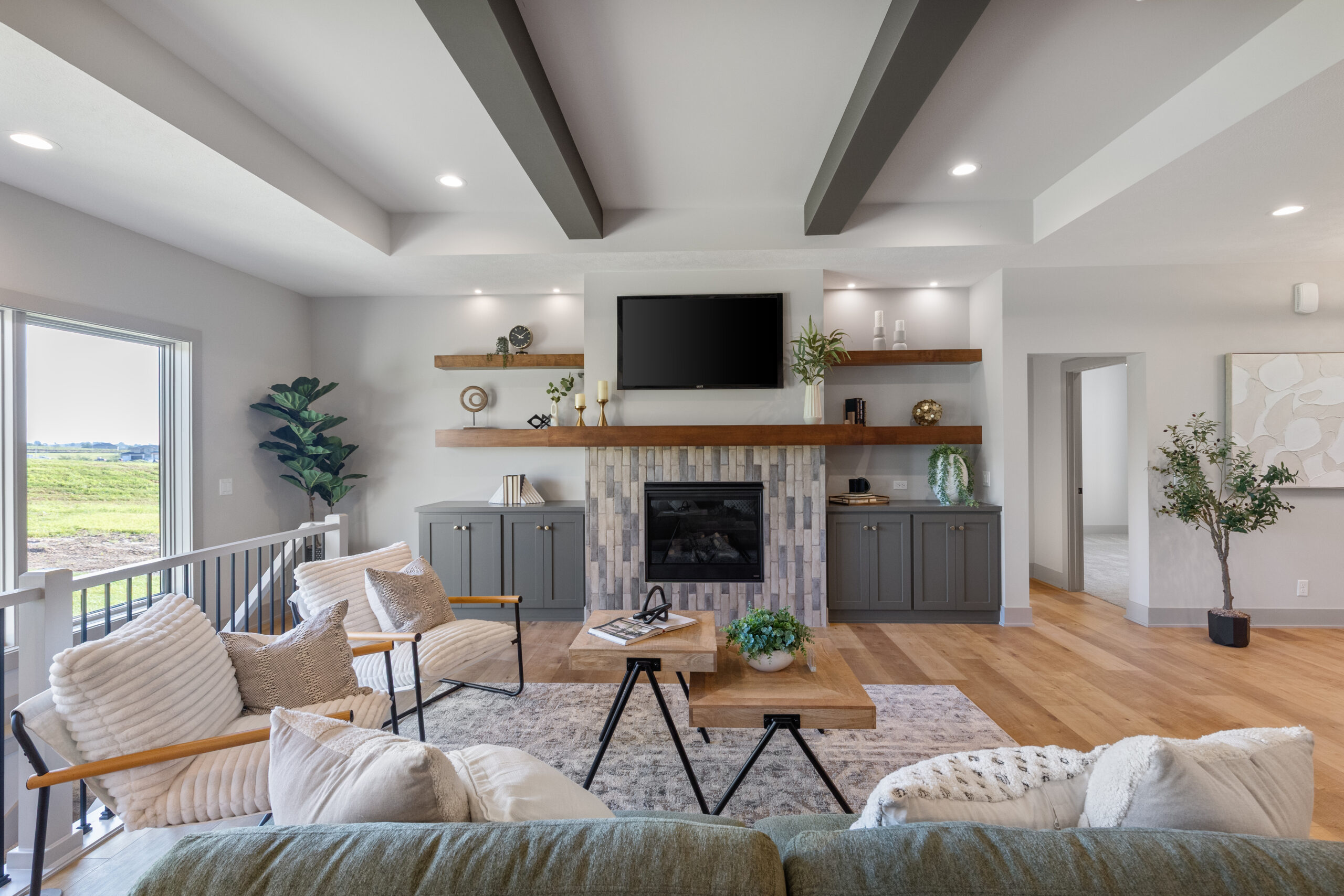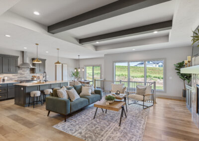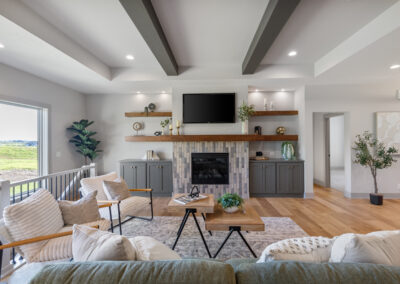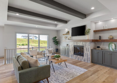 The large kitchen boasts a 36″ range with an eating area & large walk-in pantry. The living room includes a gas fireplace, beam ceiling, and large windows floating above the staircase to the lower level. Two more bedrooms occupy the main level, each with walk-in closets.